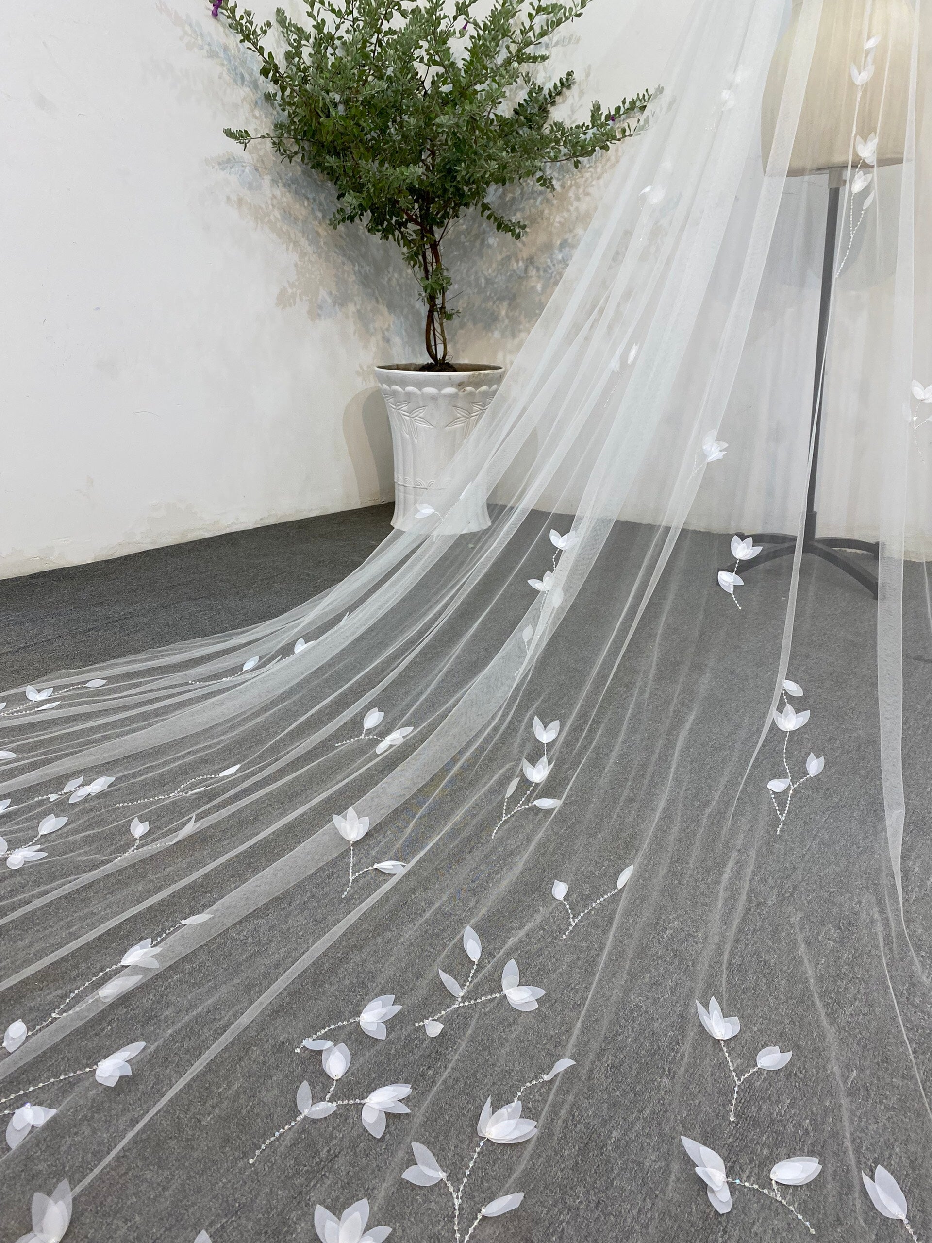 Graceful 3D White Flowers Wedding Veil – Handmade Bridal Accessory | Chapel Length