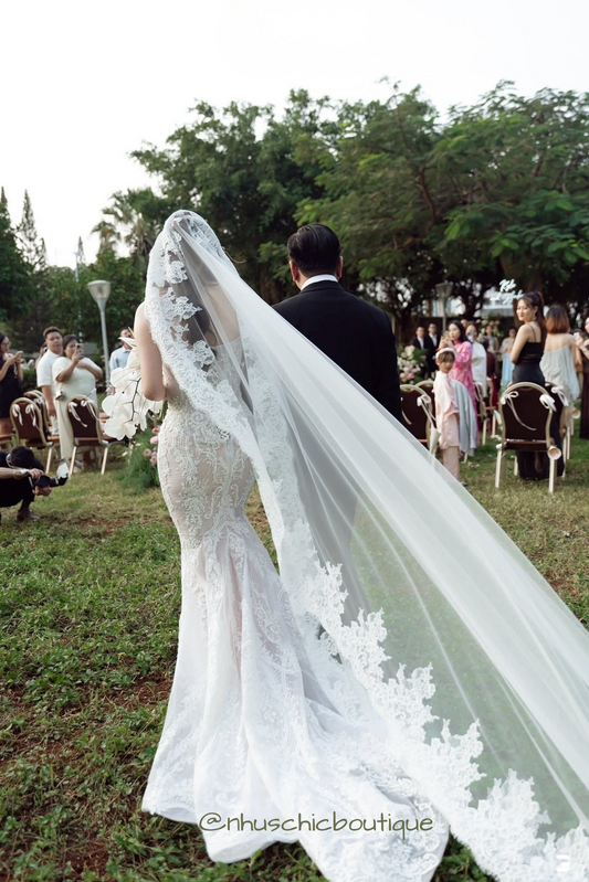 WD050-The Isla Bespoke Mermaid Wedding Gown – Hand-Appliquéd Lace Silhouette with Mantilla Cathedral Veil